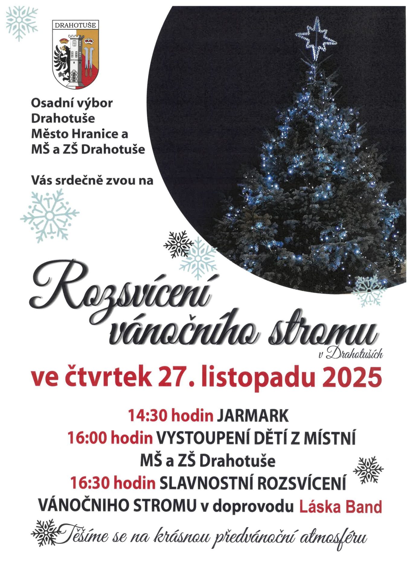 Slavnostní rozsvícení vánočního stromu se uskuteční ve čtvrtek 28. listopadu na náměstí Osvobození v Drahotuších. Vstup je zdarma.