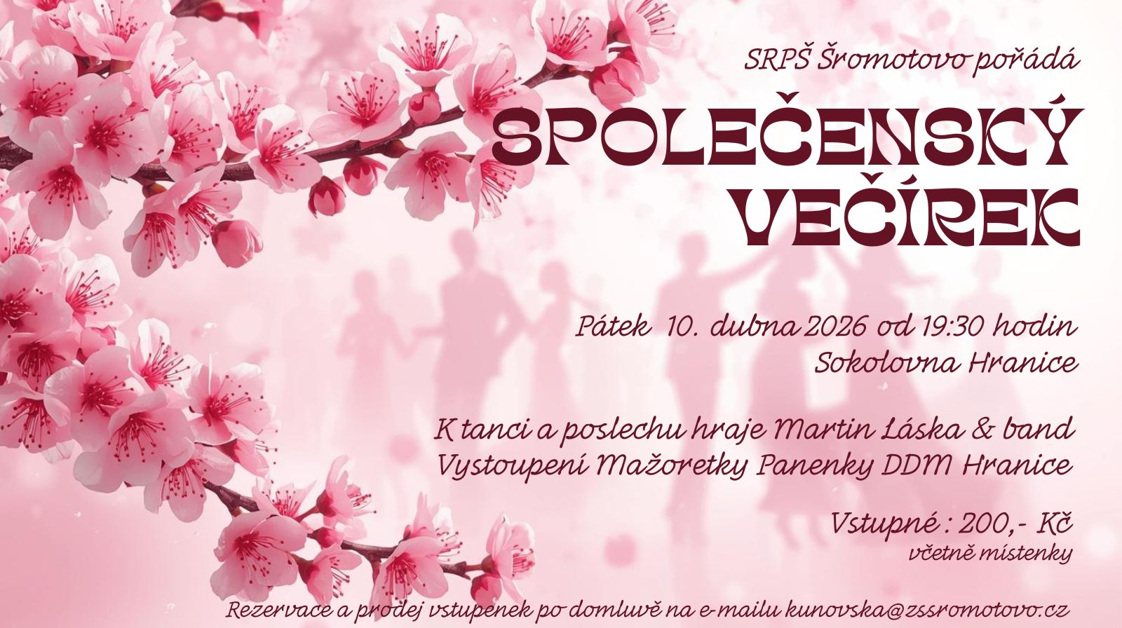Společenský večírek školy Šromotovo se bude konat v pátek 10. dubna od 19.30 hodin v hranické sokolovně. Vstupné je 200 Kč. Rezervace a prodej vstupenek na kunovska@zssromotovo.cz.