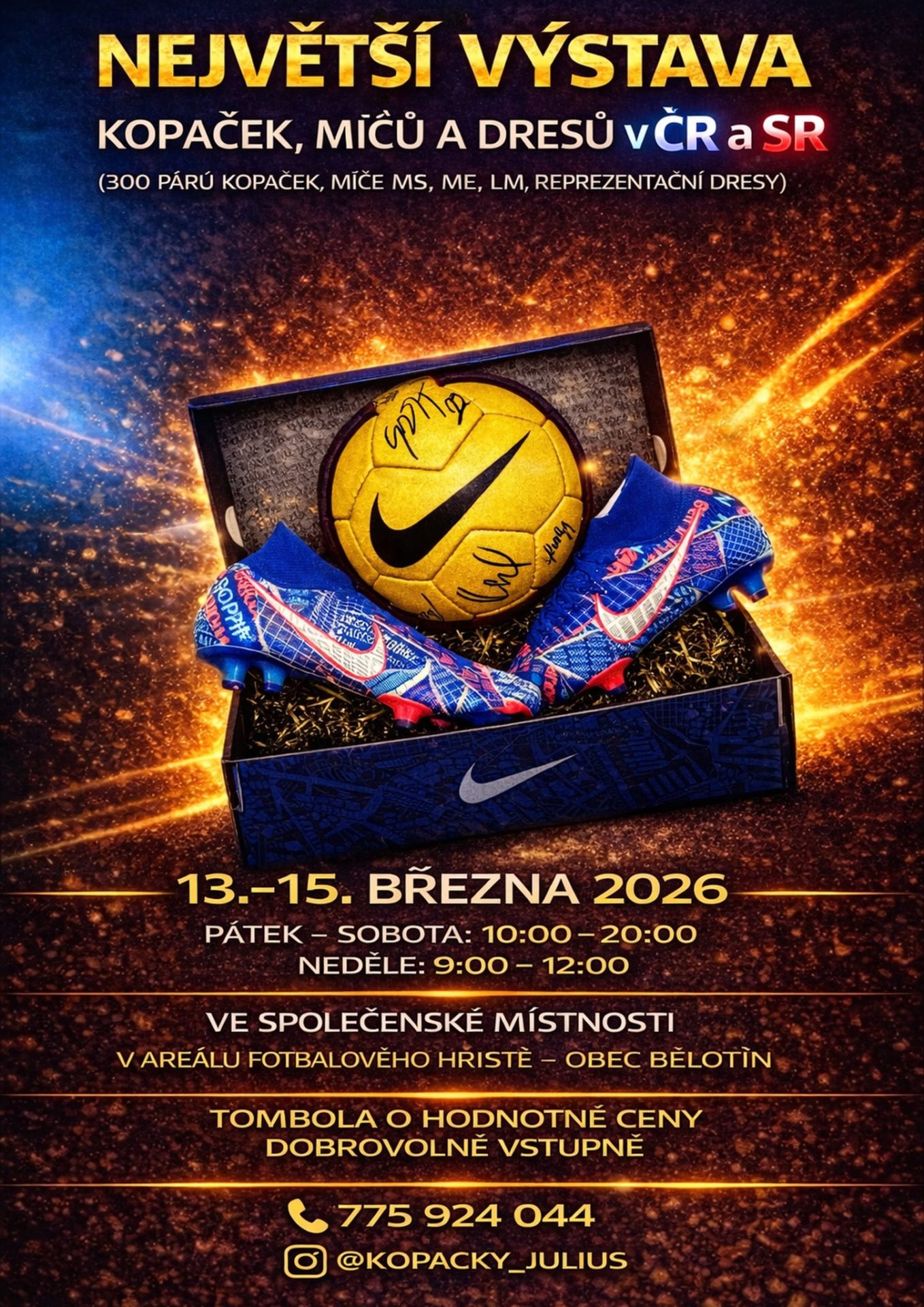 Největší výstava kopaček, míčů a dresů bude k vidění od pátku 13. do neděle 15. března ve společenské místnosti v areálu fotbalového hřiště v Bělotíně. Vstupné je dobrovolné.